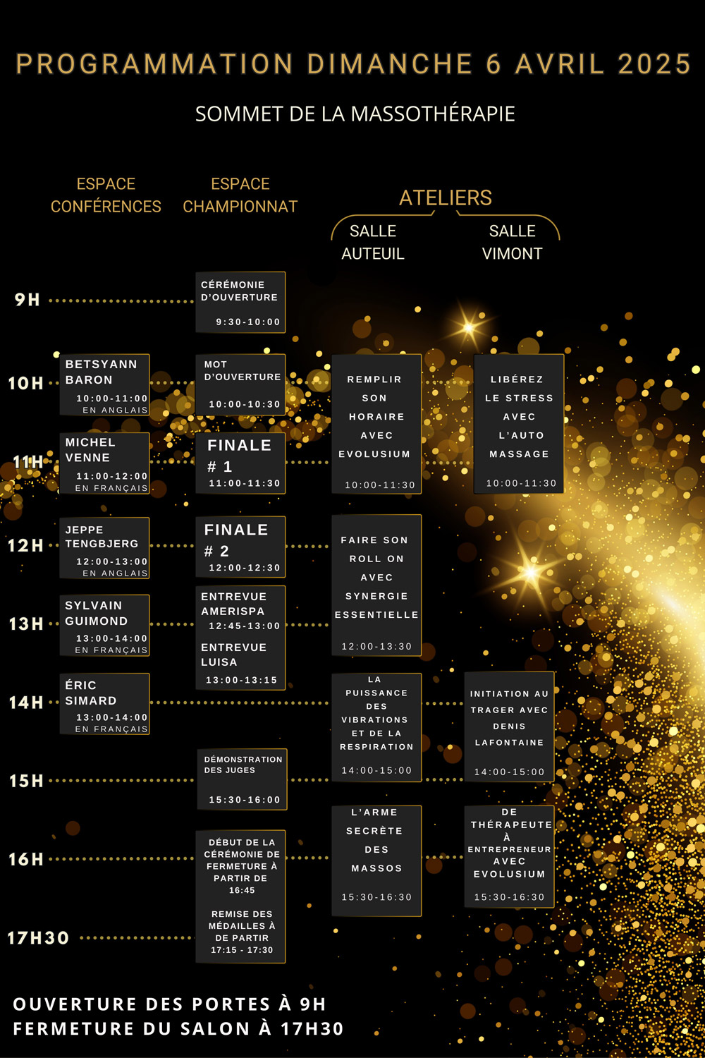 Le Sommet est de retour pour sa 3e édition ! Un rendez-vous incontournable où passionnés de bien-être, massothérapeutes, cliniques, spas et centres de santé se réunissent pour faire rayonner les bienfaits du massage sur la santé globale.