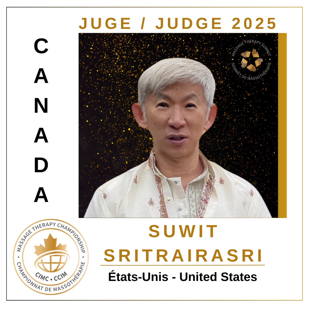 Suwit Sritrairasri est un instructeur de massage expérimenté, spécialisé dans le Thai Dancing Massage, les massages innovants et l’anatomie fonctionnelle et massages. Il est massothérapeute agréé en Floride et occupe le poste de conseiller pour la Nuad Thai & Spa Association of America. Suwit a également été chef des relations publiques de la World Association of Nuad Thai & Spa et a agi comme juge lors de plusieurs championnats de massage, apportant son expertise à la communauté professionnelle du massage.